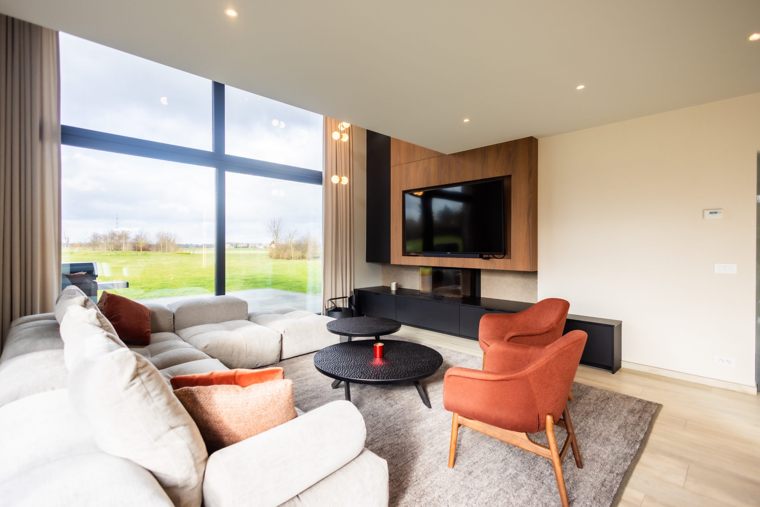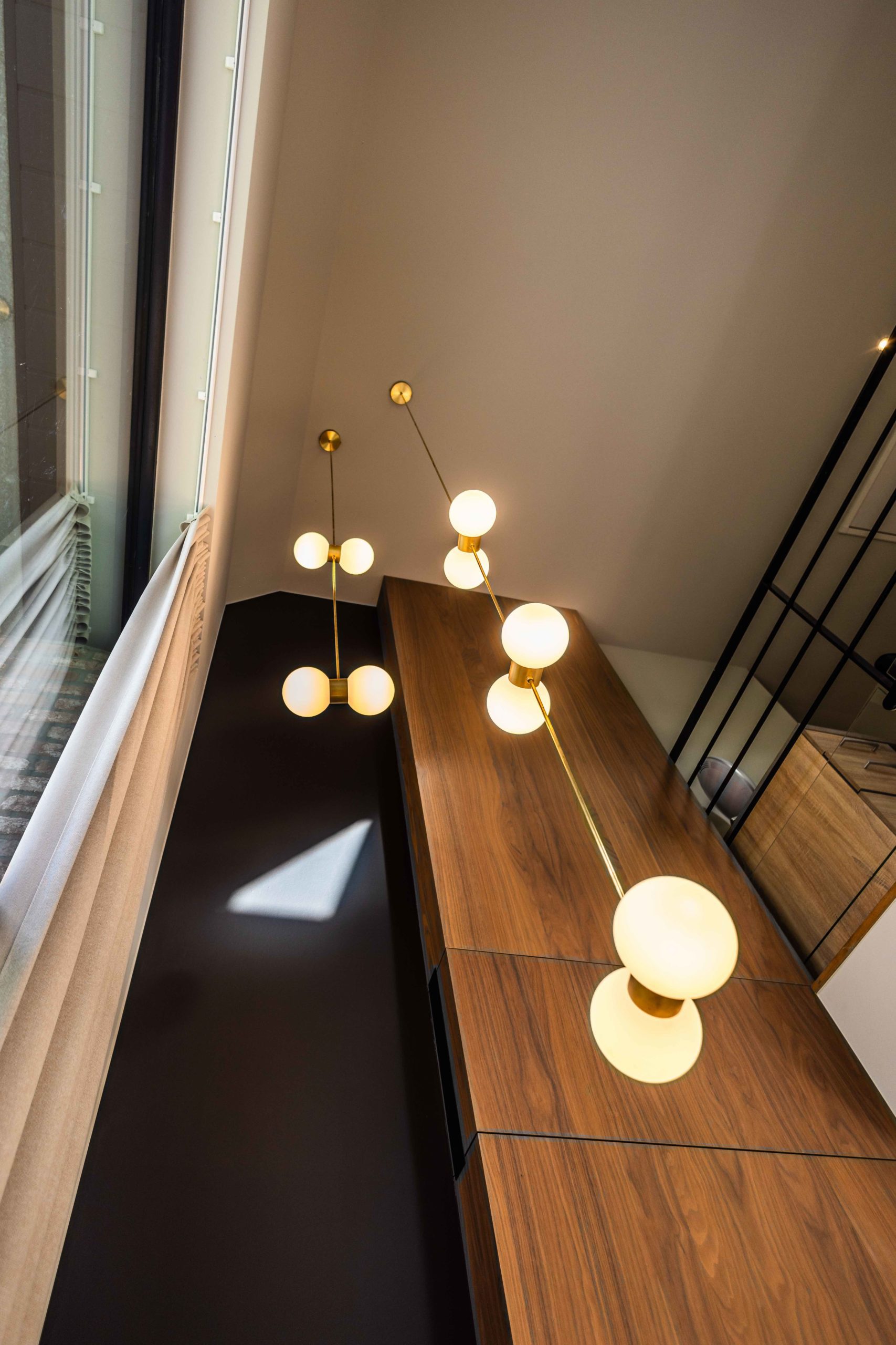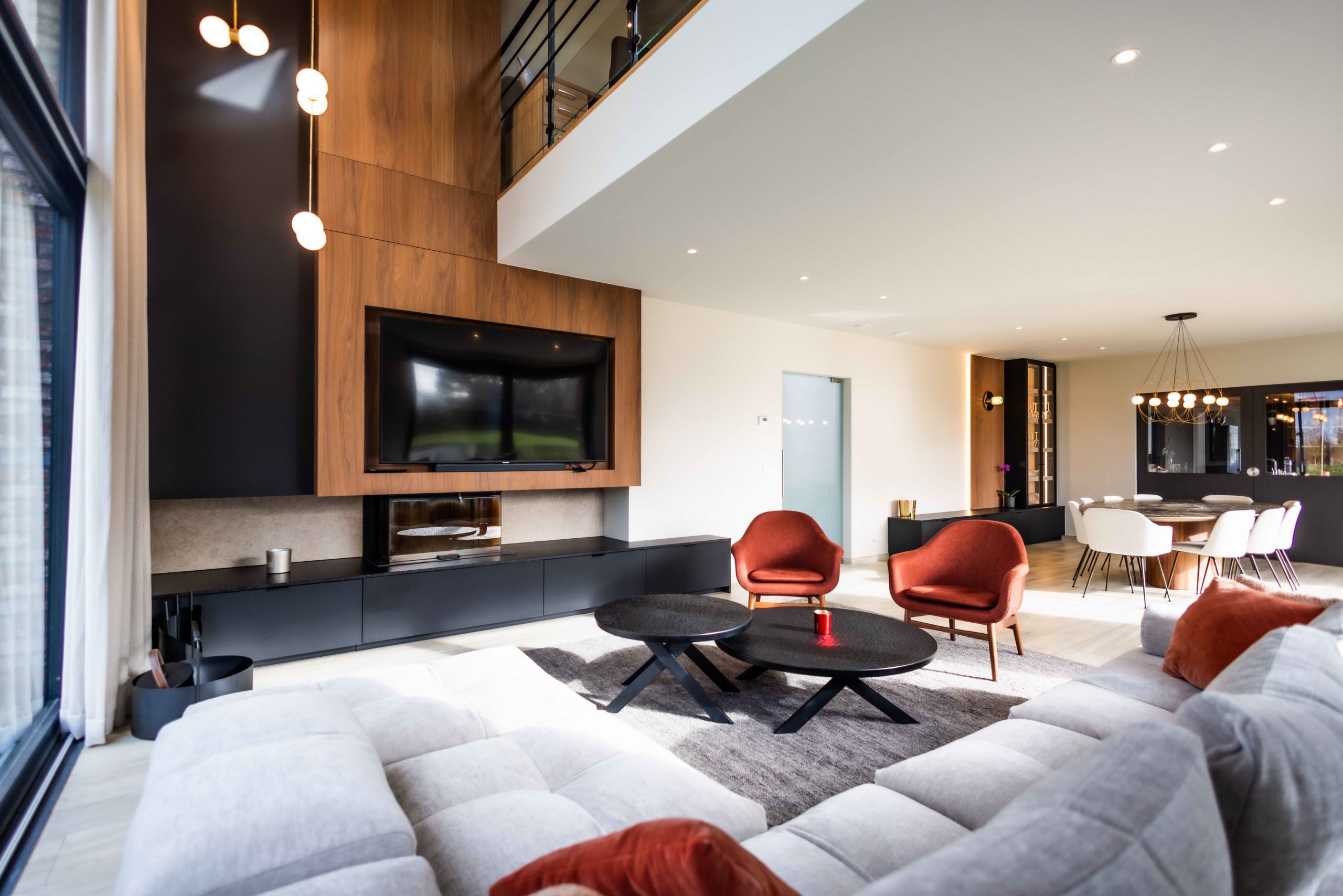 Le meuble TV, intégrant un feu au bois, devient la pièce centrale du séjour. Il se prolonge visuellement vers l’étage grâce à la mezzanine et à une composition en double hauteur, mise en valeur par un luminaire sculptural qui accompagne cette verticalité.