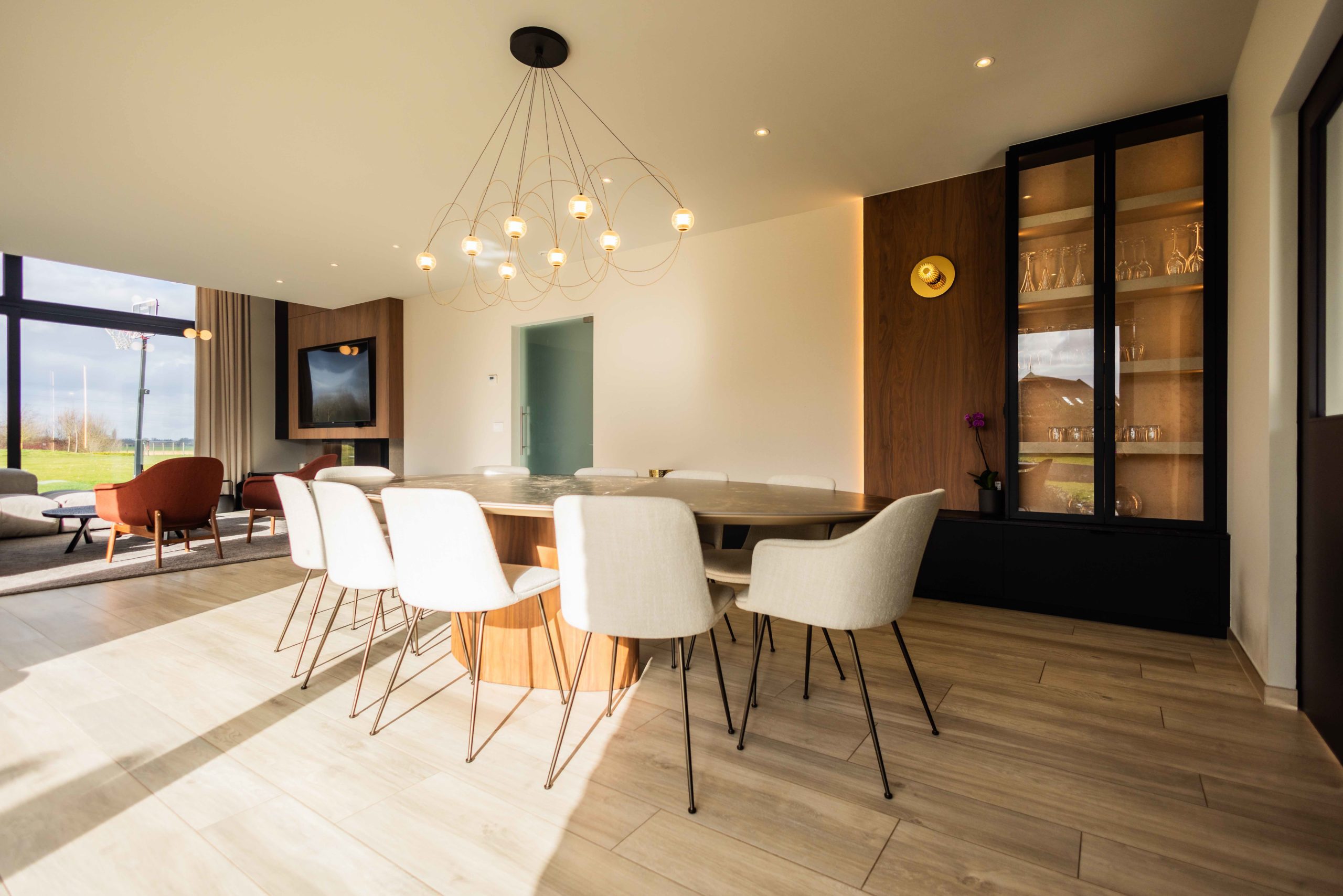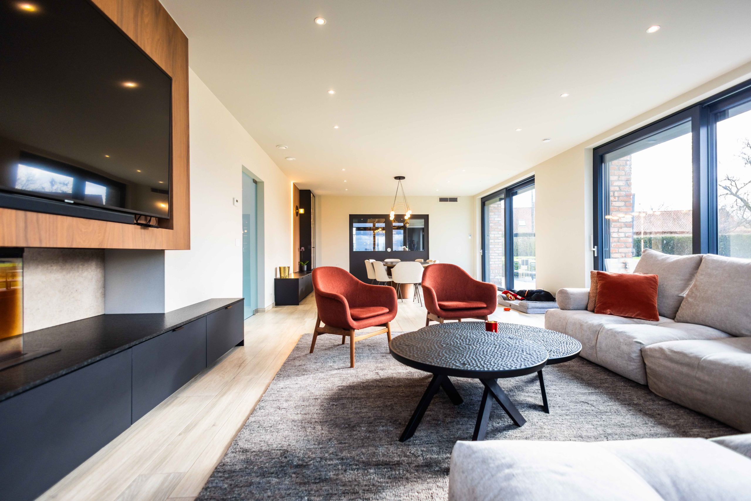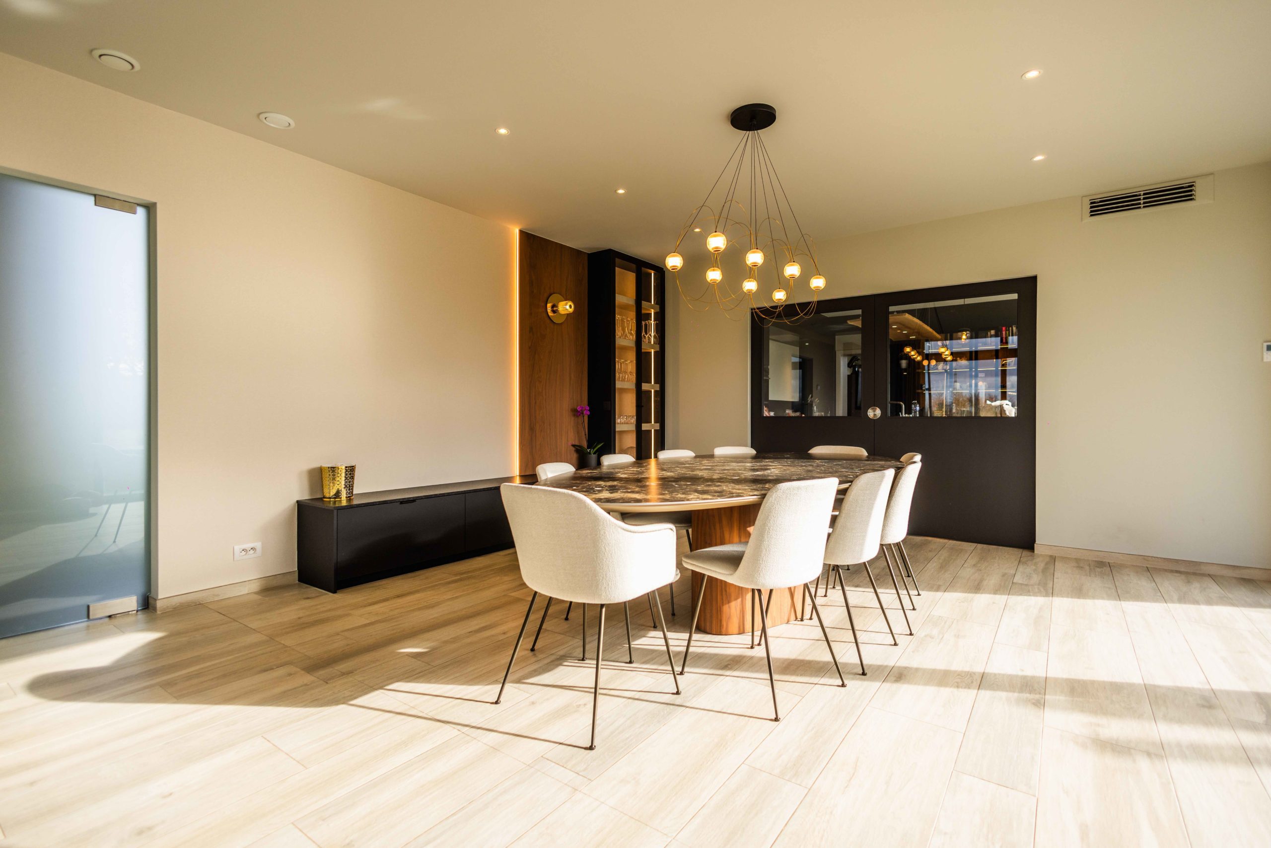 Nous avons accompagné les clients jusque dans le choix du mobilier et des textiles : table, chaises, canapé, tapis et luminaires ont été sélectionnés pour composer un intérieur cohérent, élégant et profondément personnalisé.