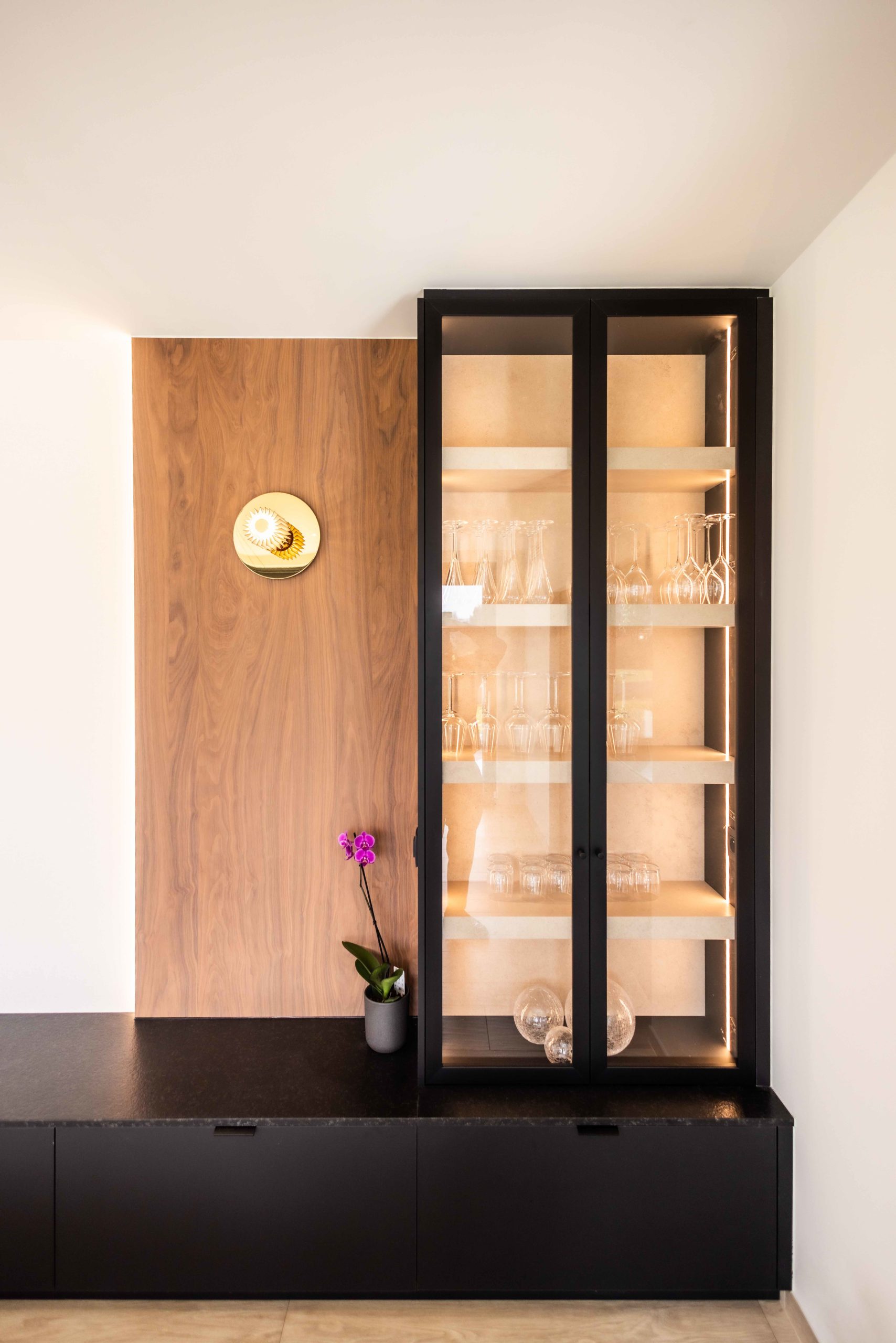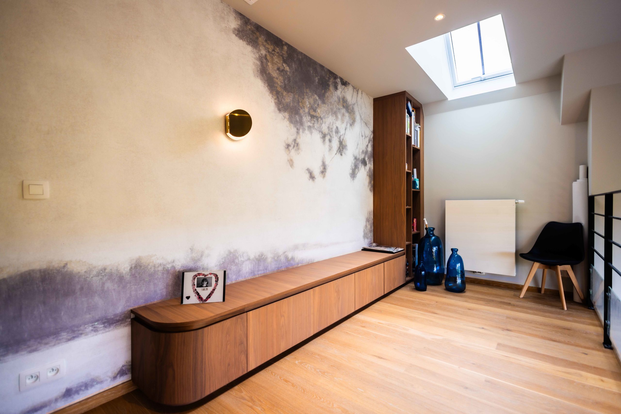 En supprimant certaines cloisons et en retravaillant les circulations, nous avons ouvert les espaces de vie afin de laisser entrer la lumière et d’installer une atmosphère plus fluide, contemporaine et chaleureuse. Le projet s’est ensuite construit autour d’un fil conducteur fort : le mobilier sur mesure et la mise en scène de la lumière.