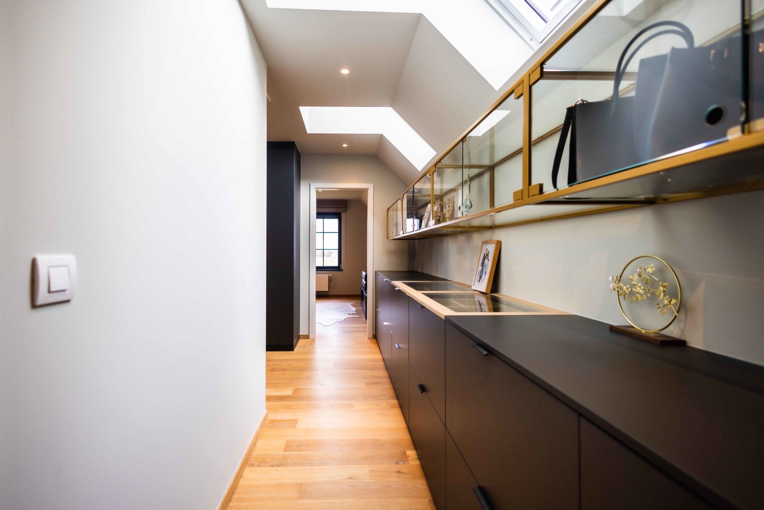 Un espace dressing a également été conçu avec une vitrine métallique laquée dorée et vitrée, permettant d’exposer accessoires et bijoux comme de véritables objets décoratifs.