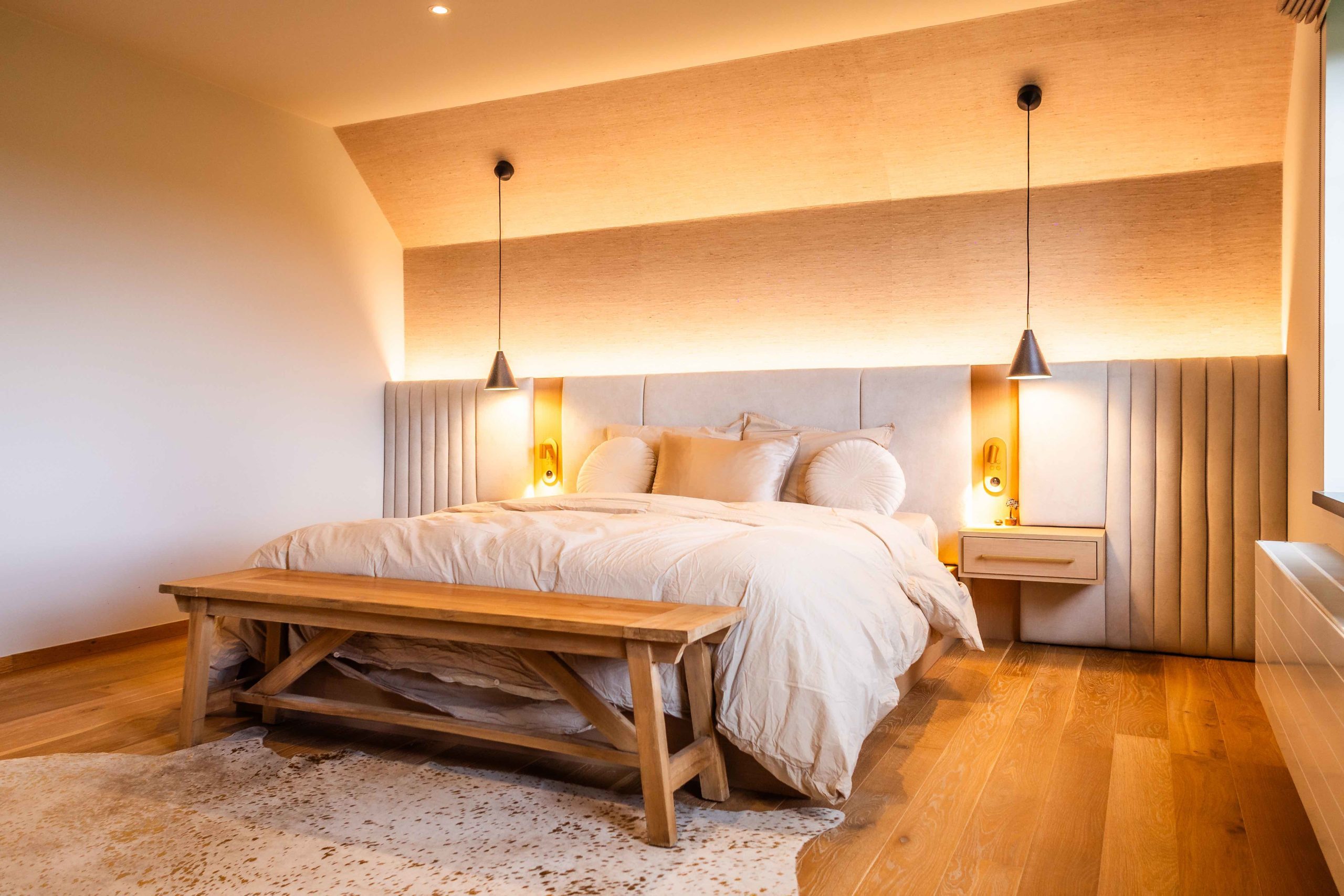 À l’étage, nous avons entièrement repensé la suite parentale, avec une tête de lit sur mesure inspirée de l’univers hôtelier, créant une atmosphère douce et enveloppante.