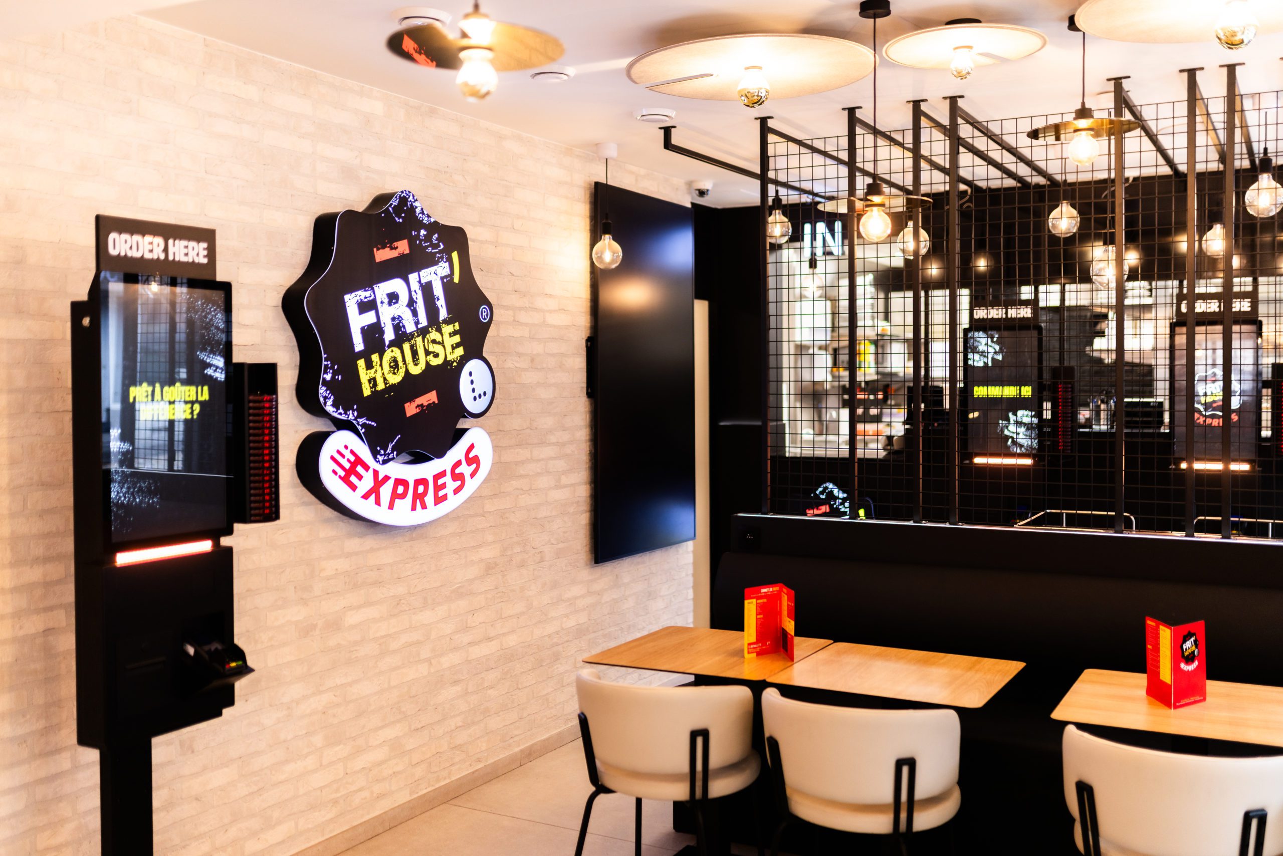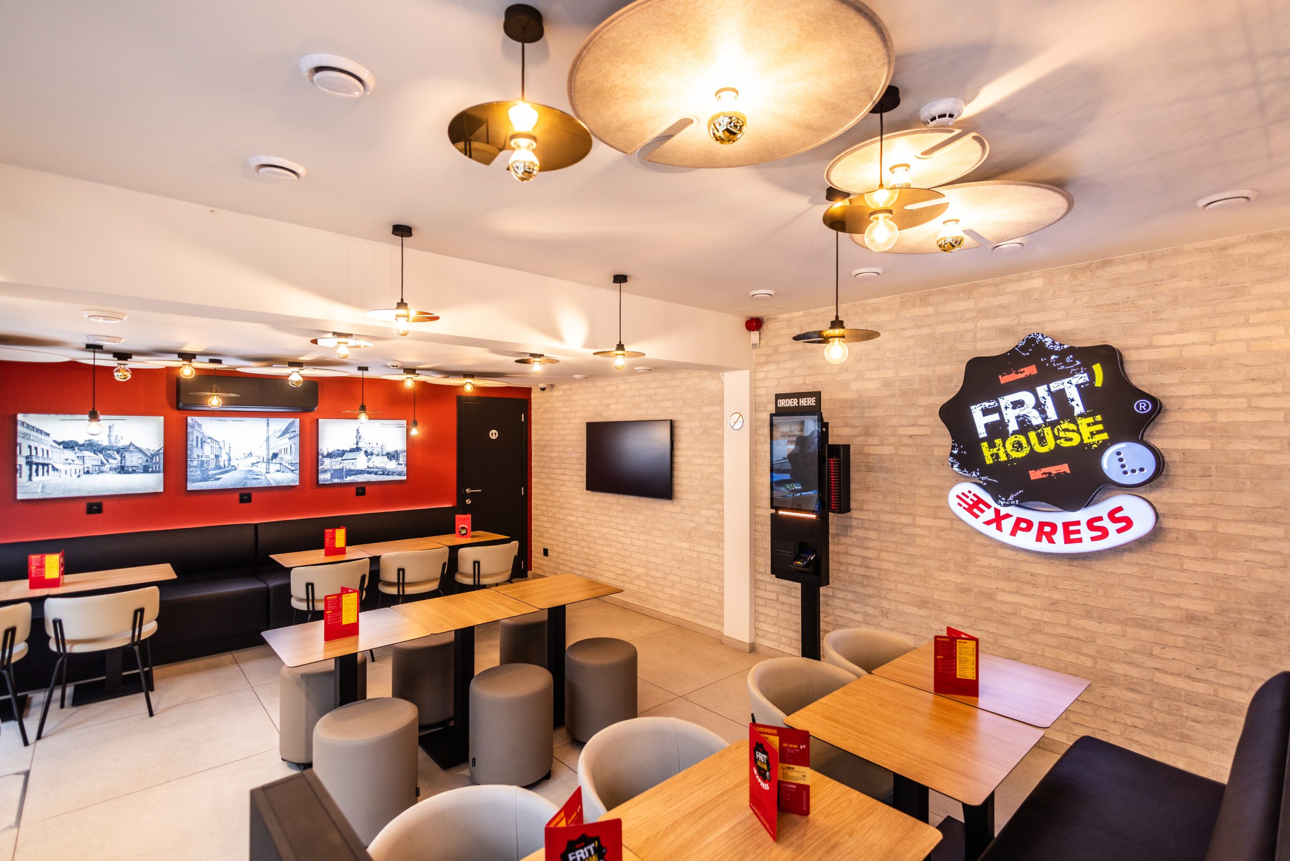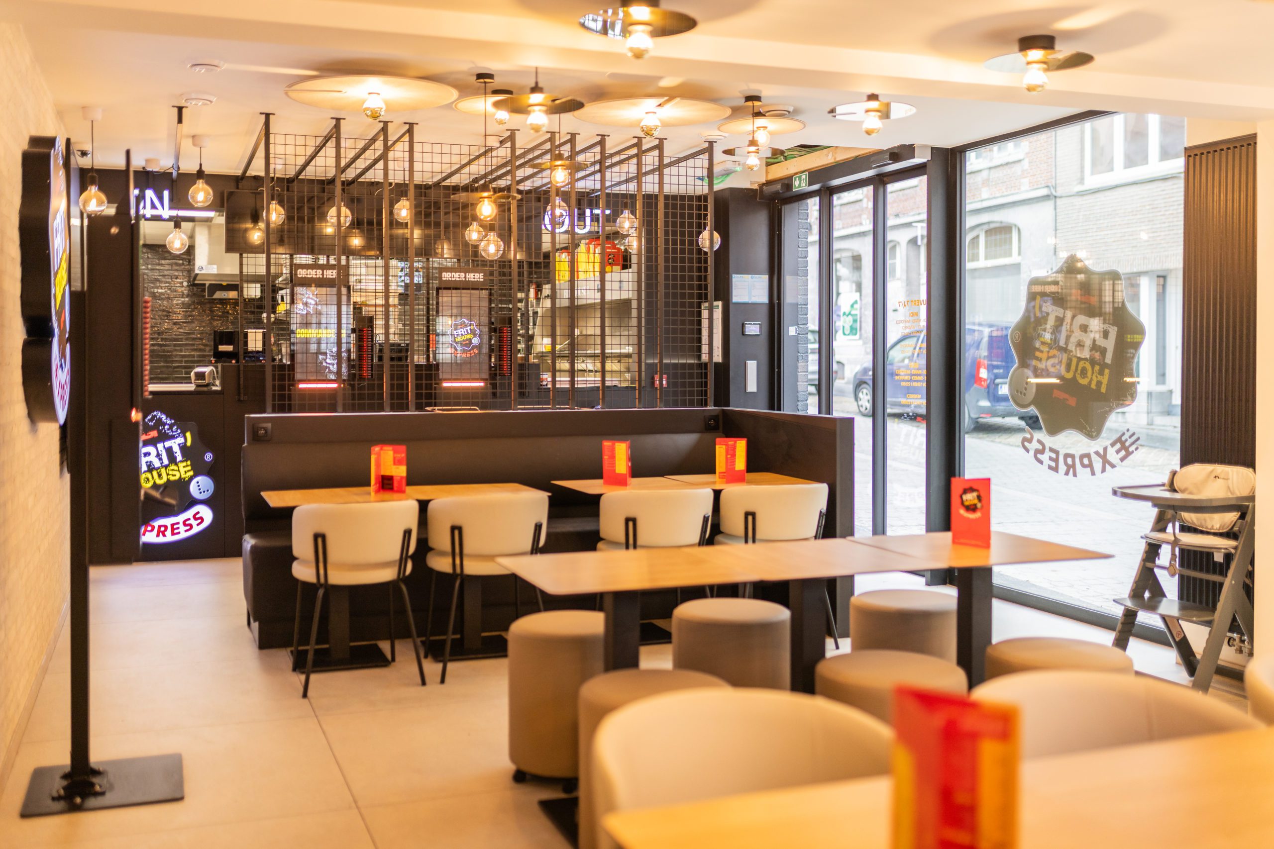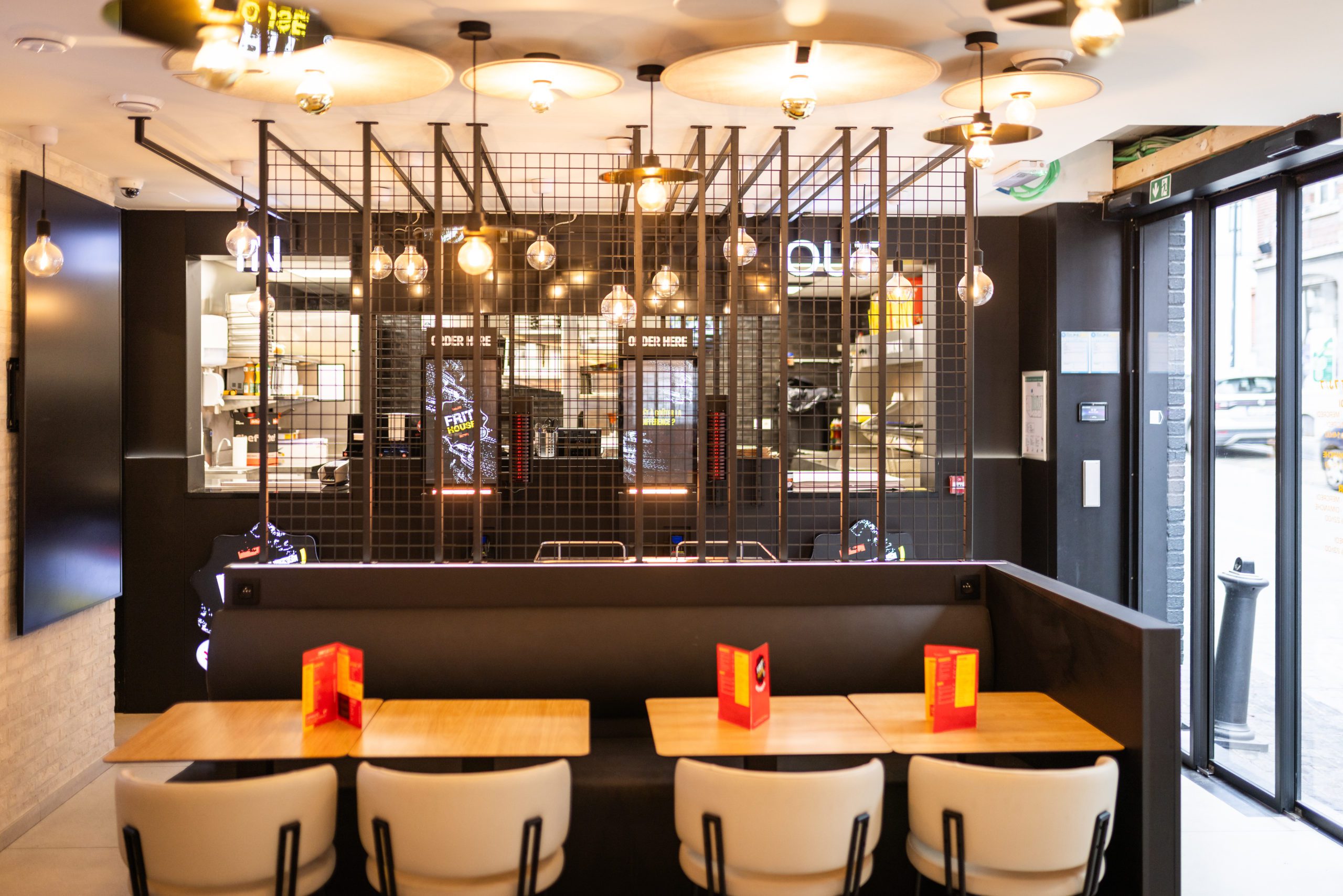 Pour ce projet, l’enjeu était de transformer une friterie existante en un lieu plus contemporain, chaleureux et accueillant, capable de répondre aux nouveaux usages : manger sur place, emporter rapidement, commander de manière autonome.